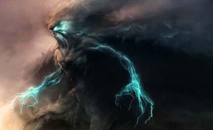 Глаза Синтии распахнулись в немом шоке. Прямо над ними возвышалось огромное чудовище, состоящее из черного дыма. Словно ожившая грозовая туча. Девушка отчетливо видела яркое свечение глазниц на морде существа, под которым черный дым складывался в огромного размера причудливый рот. Под ними, словно сотканные из электричества, медленно перемещались огромные четырехпалые конечности монстра, с пальцев которого ежесекундно срывались снопы молний, метящих в выглядящего совсем малой крохой на фоне такого гиганта наблюдателя.
