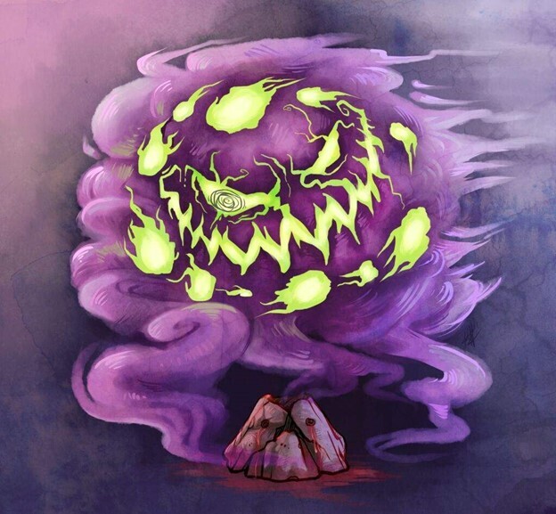 — Хе-хе… А-ха-ха! — вновь рассмеявшись на несколько десятков голосов, из подвисшего в воздухе камня вырвалось зловещее темно-фиолетовое облако, внутри которого кружили десятки, если не сотни зеленых точек. В его центре прорезалась жуткая клыкастая улыбка, состоящая из зеленого света, а чуть выше нее появилась пара таких же зеленых провалов, окруженных трещинками — провалы глазниц покемона.