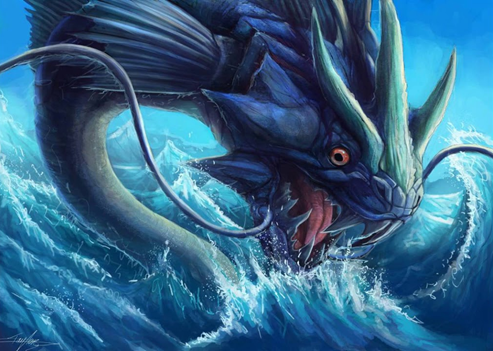 Пучина вспухла, запенилась. Сперва из-под воды показались пара объемных усов, каждый из которых был толще плавающих неподалеку майлотика и гаярдоса. За ними показался рог, сравнимый по размерам с утесом, а после выглянула и остальная морда чудовища. По тяжелым надбровным дугам стекали целые реки соленой воды, напрочь игнорировавшейся покемоном, что вперил свой разъяренный взгляд в зависших в воздухе людей. Подъем прекратился, когда снаружи показался кончик носа, из ноздрей которого фонтаном вырвались потоки воды, едва не забрызгав ошарашенную троицу.