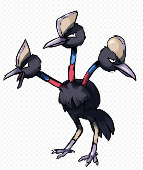 Проследив за взглядом девушки, я увидел шайни додрио — трехголовую нелетающую птицу с массивным округлым телом, покрытым крайне плотным оперением. Длинные мощные лапы с внушительными когтями на них оставались лысы, как и три длинные шеи, а вот сами головы пернатого уже были покрыты плотным, даже пушистым оперением. Обычно, эти покемоны имеют бледно-рыжий или светло-коричневый окрас, но перья этого представителя были полностью черны. Шеи их были странного цвета: нижняя часть ярко-красная, а верхняя — нежно-голубая, и никакого плавного перехода, словно кто-то решил поделить их пополам.