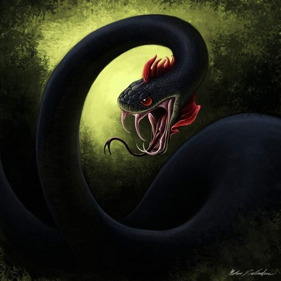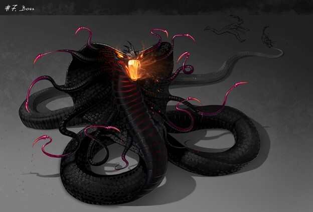 Мгновение, и огромный четырехрукий силуэт, доселе наслаждавшийся немощью противника, буквально распадается на части, сопровождая сие действо утробным воем. Лес огласил раскат грома: такой поднялся следом грохот, от пролетевшей сквозь дымчатое призрачное тело туши. Огромное змеиное туловище, не уступающее размерами исполинским деревьям, растущим в этих лесах, рухнуло прямо перед Сириусом. Черная кобра расправила широкий капюшон, украшенный длинными подвижными, словно ее собственный хвост, отростками, что толстыми черными жилами тянулись сквозь весь капюшон, прямо к остову змеиного тела. Кончались же эти непрерывно извивающиеся щупальца немаленькими, размером с хвост Сириуса, красными жалами, с которых буквально капал красный же яд, что с шипением растворял черную землю при соприкосновении.
