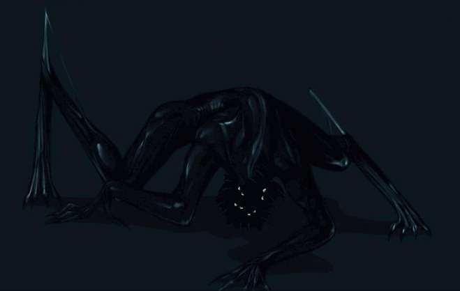 Не успела она подняться на ноги, как за спиной вновь раздалось смачное чавканье. Как можно быстрей девушка поднялась, и отбежала от опасного места подальше, и лишь затем обернулась, увидев, как из черной бездны вылезал владелец схватившей ее недавно конечности, ожоги на которой едва могли скрыться за тонким слоем густой черной жижи, из которой состояла окружающая «трясина». Высокое угольно-черное существо, с тела которого капала все таже густая жидкость, медленно, опираясь обеими своими гротескными конечностями на берег, который начал осыпаться под явно немаленьким весом твари, выбиралось наружу, не сводя при этом своих белесых глаз с девушки.