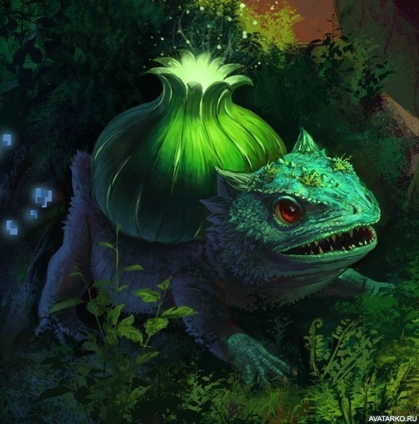 Увидев нас с Мисти, все покемоны насторожились, а особо пугливые даже убежали прочь. Однако бульбазавр, который, видимо, был в этой компашке травяных покемонов за старшего, вышел вперед, заградив нам дорогу. Он растопырил передние и задние лапы, склонив корпус перед, встав таким образом, что в любую секунду мог как сорваться в длинном прыжке, дабы вцепиться частоколом пусть и не очень больших, но явно острых зубов в плоть нарушителей спокойствия, так и прыснуть чем-нибудь кислотно-убойным из своего бутона на спине…