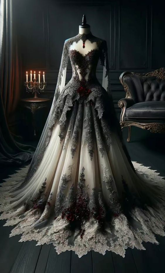 Обычное бальное платье цвета слоновой кости украсили кружева в тон, а также глубокого-бордового цвета и темно-серые. Затрудняюсь сказать, наряд светлый или темный. Загадка так и притягивает взгляд.