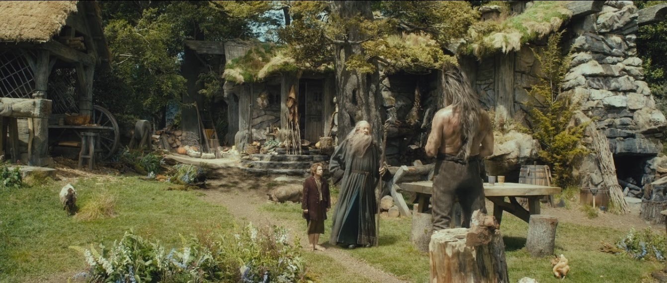 Не прошло и десяти минут, как в ворота внеслась компания гномов с Бильбо и Гэндальфом, они быстро затворили за собой створки ворот и задвинули общими усилиями гигантский засов. Повернувшись назад новые гости увидели Беорна, который вышел из дома и стоял, скрестив руки на груди, ожидая объяснений от прибывших к нему на двор незнакомцев.